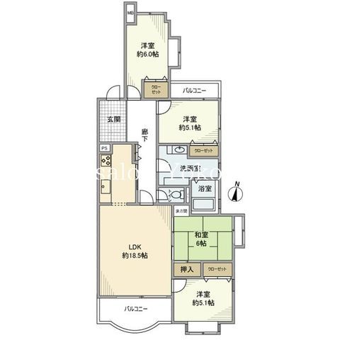 | 築年月 | 1993年2月 | 間取り | 4LDK( LDK18.5畳/洋室6畳/洋室5.1畳/洋室5.1畳/和室6畳 ) | 専有面積 | 100.29m2 |