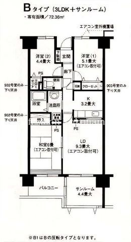 | 築年月 | 2000年4月 | 間取り | 3LDK( K3.2畳/LD9.3畳/洋室5.1畳/洋室4.4畳/和室6畳 ) | 専有面積 | 72.36m2 |