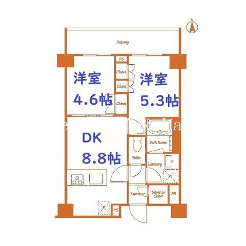 | 築年月 | 2022年3月 | 間取り | 2DK( DK8.8畳/洋室5.3畳/洋室4.6畳 ) | 専有面積 | 42.66m2 |