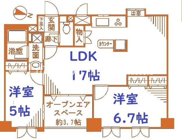 | 築年月 | 2004年2月 | 間取り | 2LDK( LDK17畳/洋室6.7畳/洋室5畳 ) | 専有面積 | 60.51m2 |