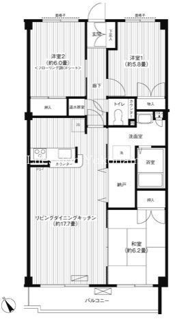 | 築年月 | 1994年3月 | 間取り | 3LDK( LDK17.7畳/洋室6畳/洋室5.8畳/和室6.2畳 ) | 専有面積 | 80.6m2 |